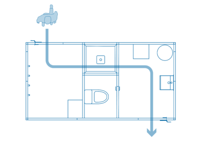 En la entrada del vestuario se debe dejar la ropa sucia del exterior y pasar por la ducha y lavamanos. Está configurado y construido de tal forma que el plato de ducha es de paso obligatorio, incentivando su uso. Una vez se encuentre en la parte limpia debe de vestirse con la ropa limpia de trabajo y ponerse el calzado limpio adecuado para acceder a las naves.