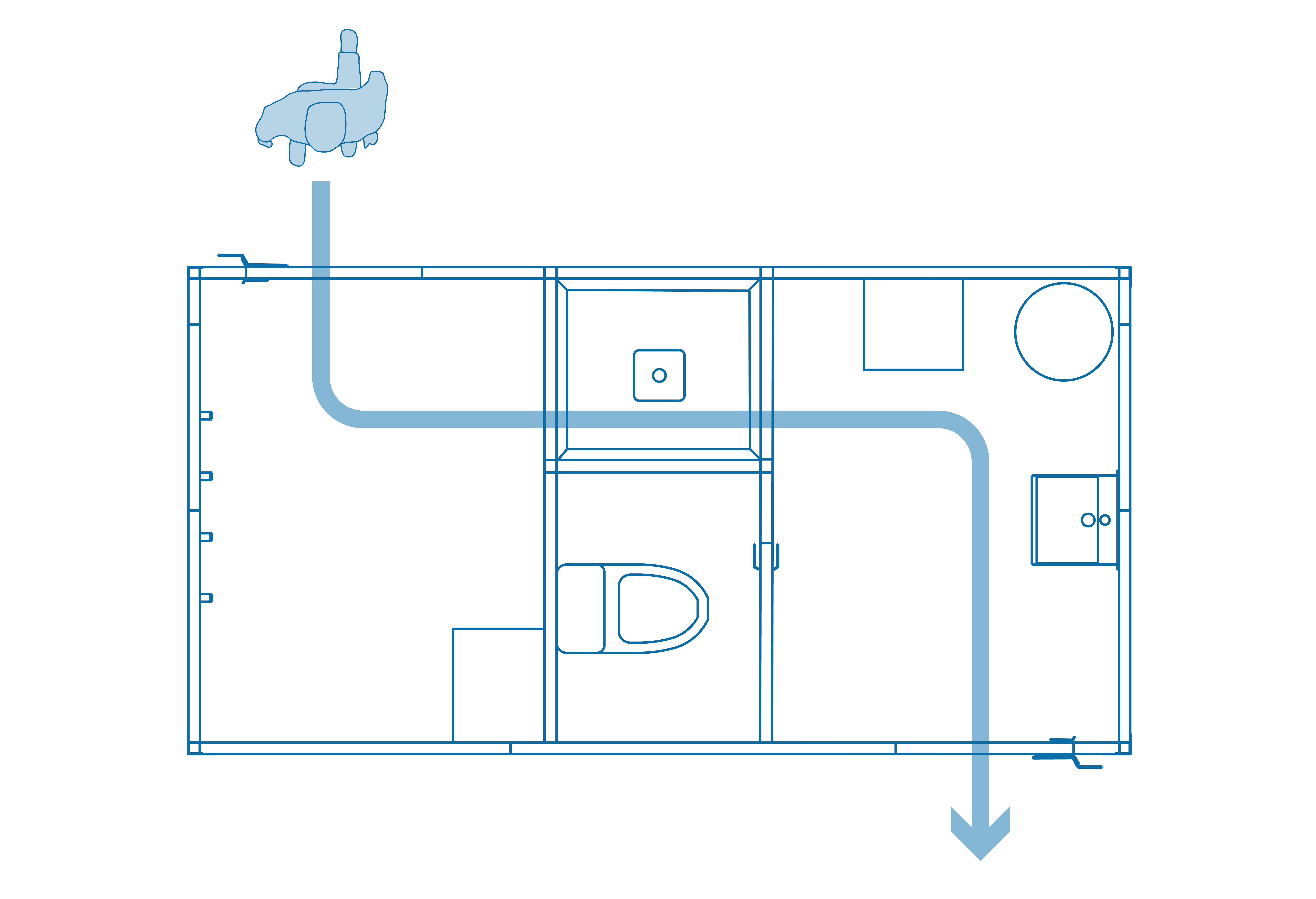 Para la instalación del vestuario se requiere solamente, una superficie firme y nivelada (bien sea una solera de cemento, o tierra muy apisonada y dura), una toma de agua y luz para conectar y alimentar al módulo. También se debe prever un desagüe para las aguas grises que se generen en su interior.